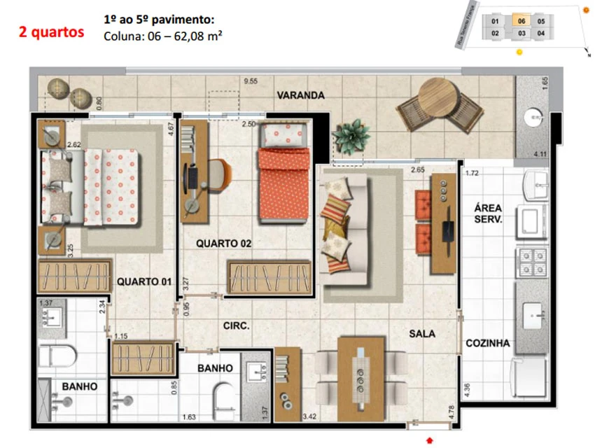 Apartamento de 2 quartos Tipo: (1 vaga) - 61,57m²; /
