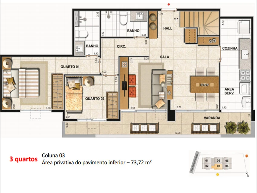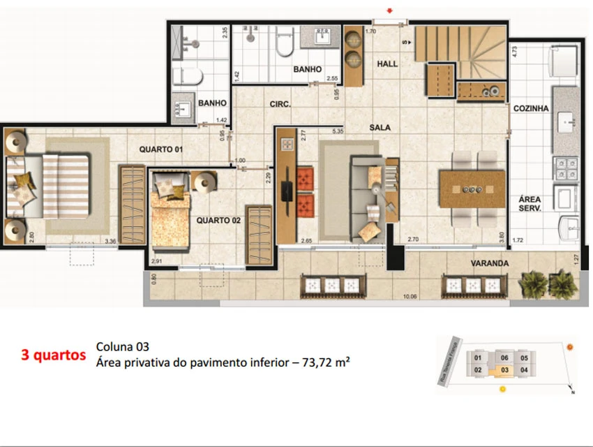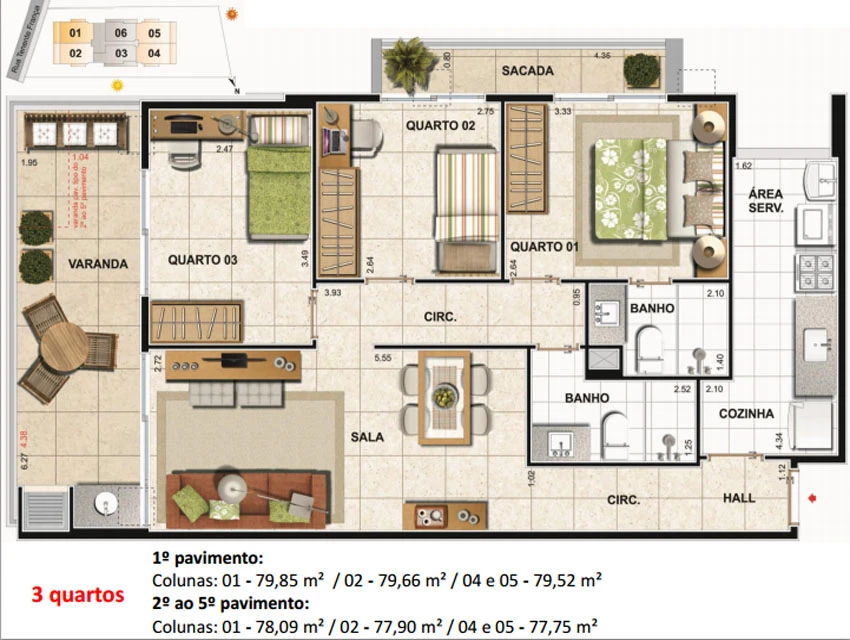 de 3 quartos (1 vagas) – 73,80 a 79,85m²;